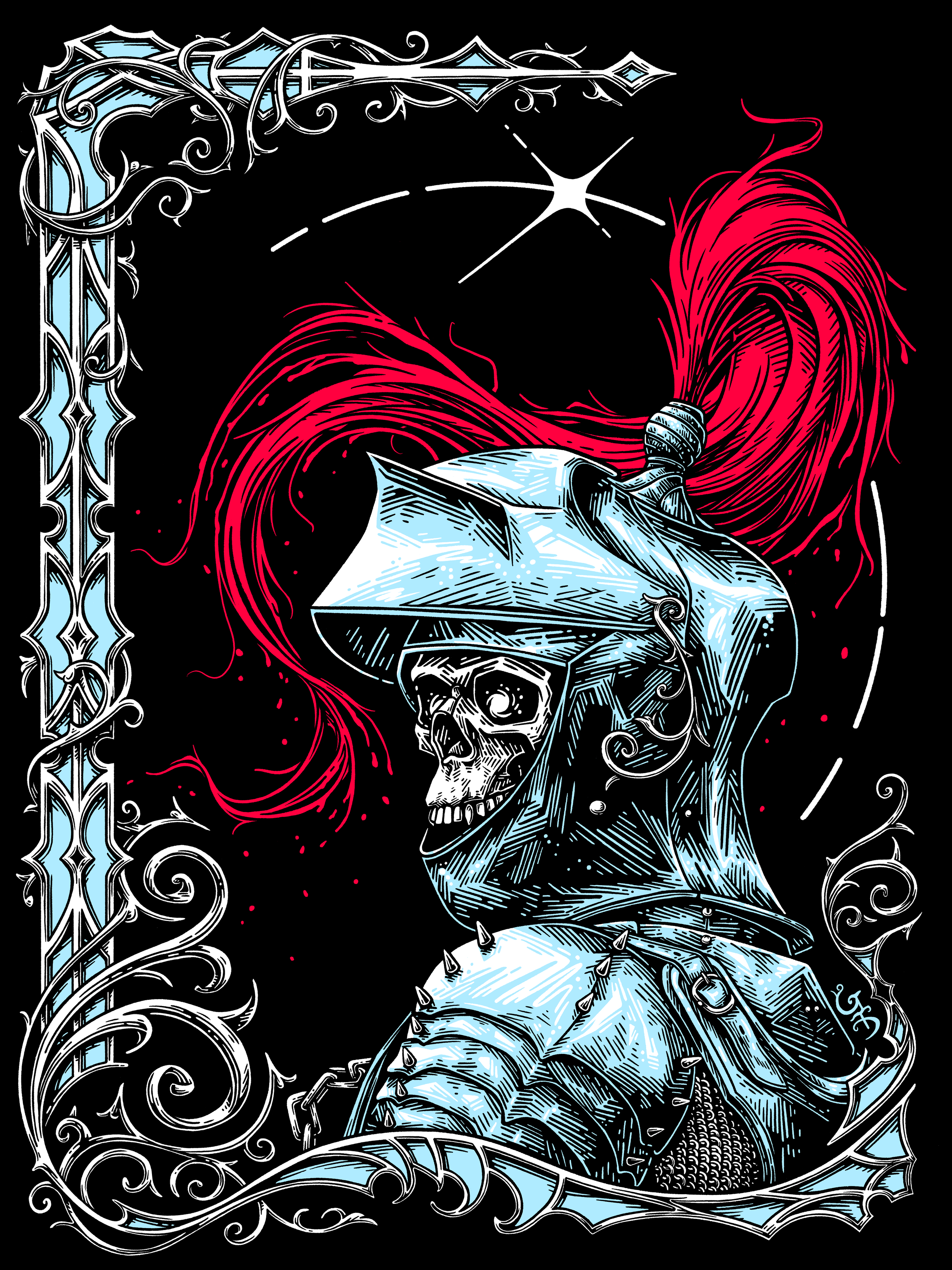 It was at this point, one of the men noticed an individual standing at the center of the crowd that stood out from the rest. Shining like a freshly minted piece of silver was a knight wearing a full suit of armor. A large, red plume was affixed to the top of this knight’s helm and flowed downward like the tip of an elongated paint brush; the worn strands of which were coated in horrid dark red clumps that dripped down thumping unpleasantly as they collided with the ground. As it slowly turned and approached them, what lay within the helm came into view, revealing a fleshless skeletal face within. Letting loose a guttural scream from within the armor, the monstrosity sent the surrounding crowd into a violent, unholy frenzy that quickly engulfed the men not yet under its control.